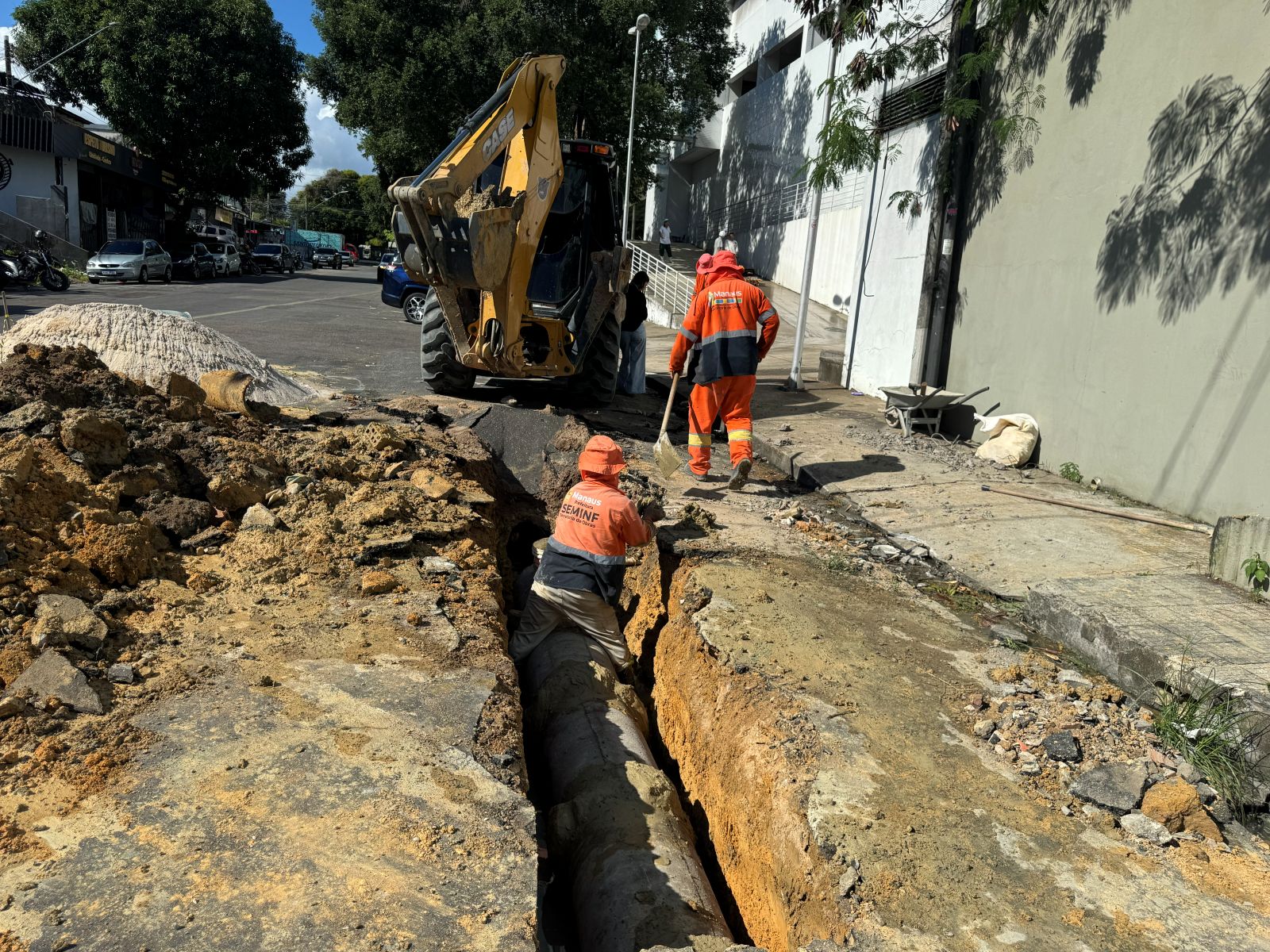 As equipes da Seminf trabalham intensivamente na rua Tomas de Vila Nova, realizando a substituição dos tubos danificados por novas manilhas em concreto armado, com o objetivo de garantir o melhor escoamento das águas pluviais e evitar alagamentos na região. A obra também inclui a limpeza e desobstrução da rede de drenagem, para promover a eficiência do sistema.
